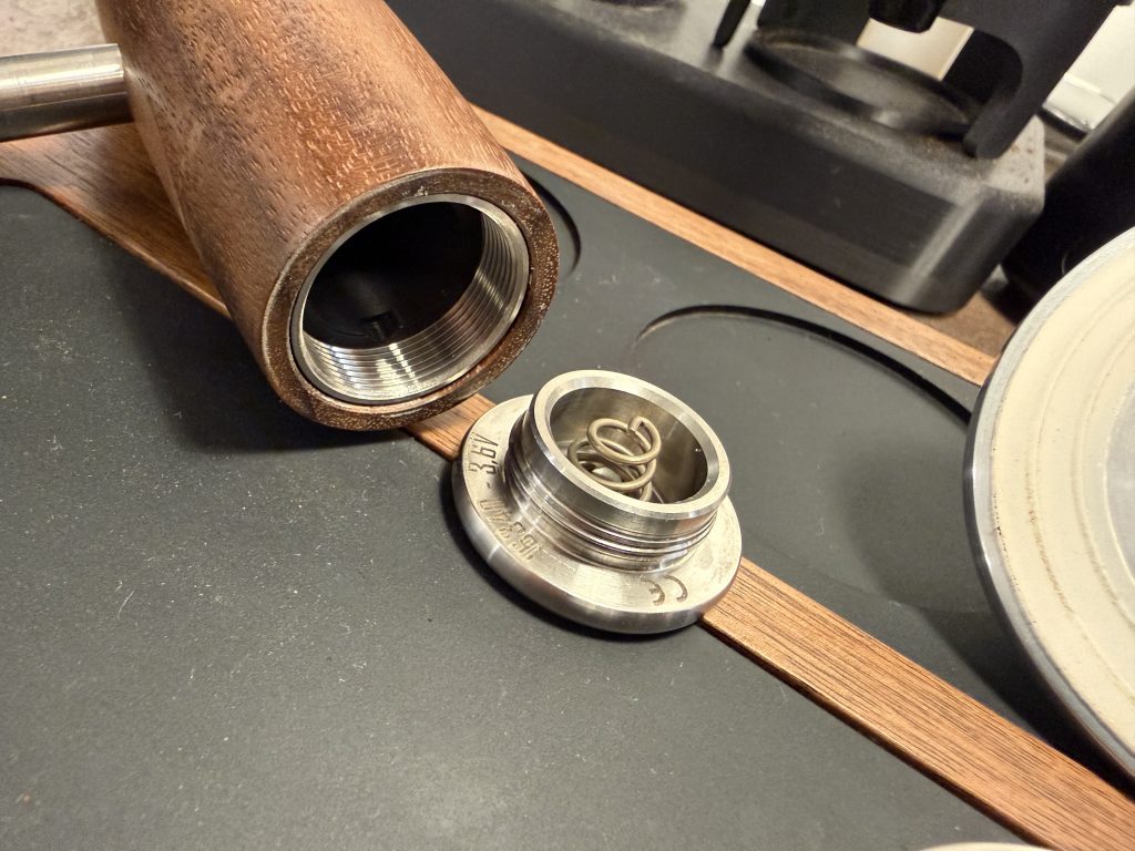 Der Equilibrium ist so konstruiert, dass er bei jeder Anwendung einen gleichbleibenden Anpressdruck (z. B. 20 kg) auf das Kaffeemehl ausübt. Dieser Druck wird durch eine kontrollierte Vibration (Schwingung) gewährleistet. Manuelles Über- oder Untertampen ist damit ausgeschlossen. - Vertikale Führung: